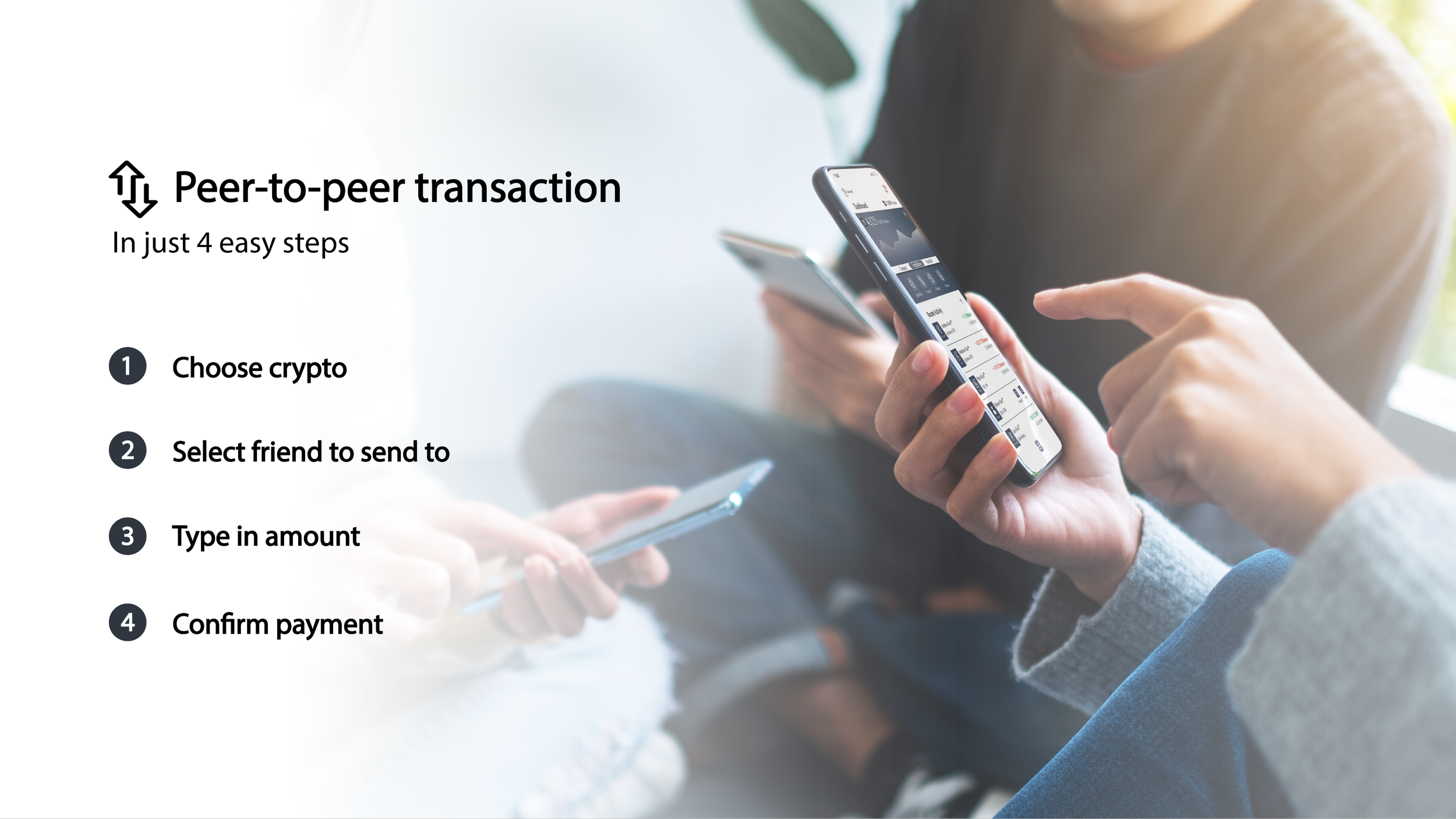 Peer-to-peer transactions on Konnex are simplified into four easy steps: select crypto, choose a friend, enter the amount, and confirm payment.
