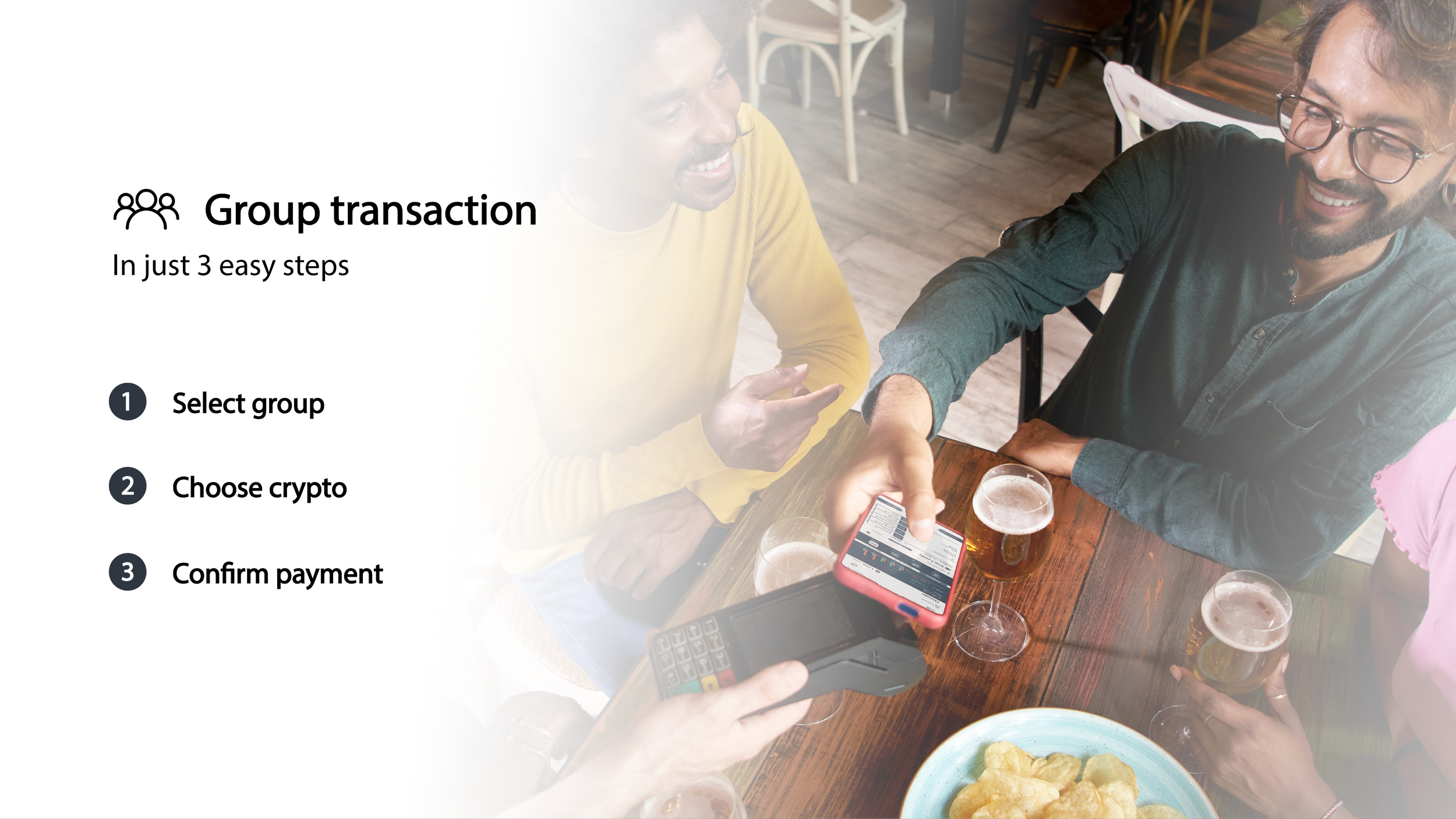 Group transactions on Konnex are streamlined into three simple steps: select group, choose crypto, and confirm payment.